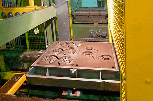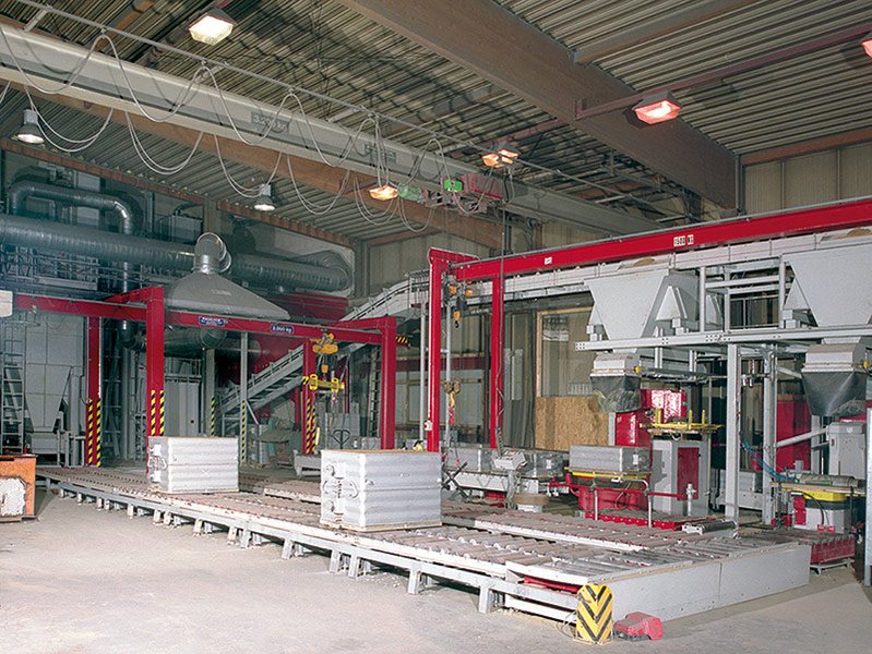 Mechanized molding systems with air pulse and / or pressing or molding machines of the Retomat or Foromat make and with molding sand preparation respectively.